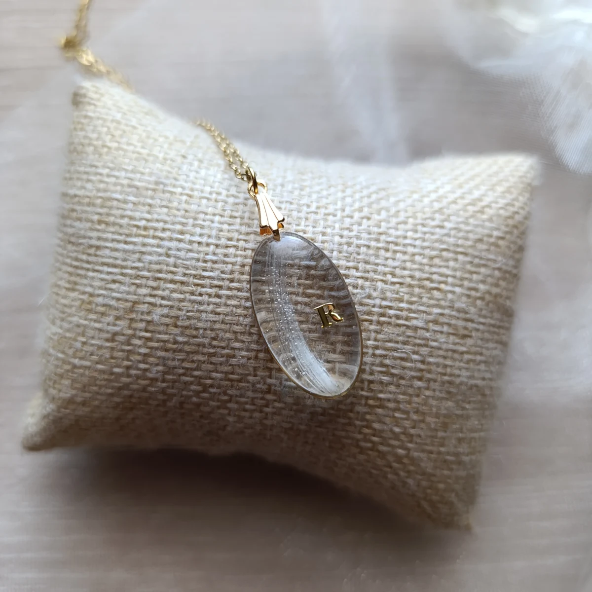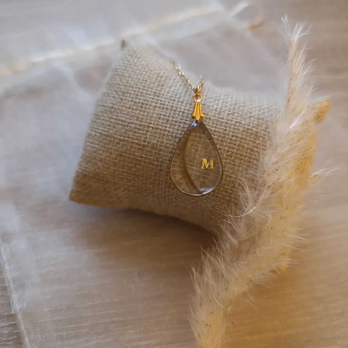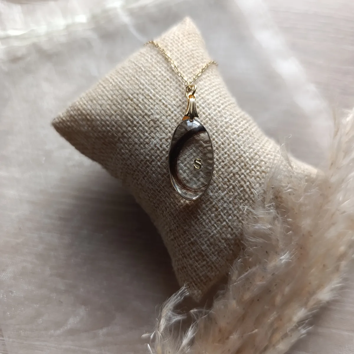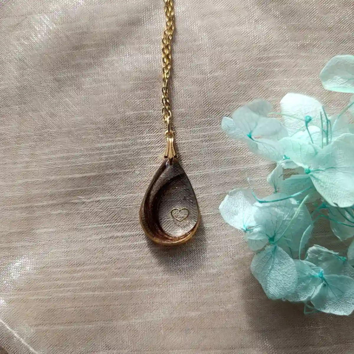 Il se compose d’une chaîne de 45 cm en acier inoxydable, disponible en finition dorée ou argentée selon votre choix, ainsi que d’un pendentif réalisé en résine époxy dans mon atelier.